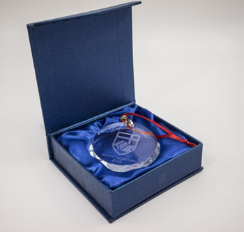 Designer gift box with self-locking system, two toned exterior, and an interior lined with black velour.
