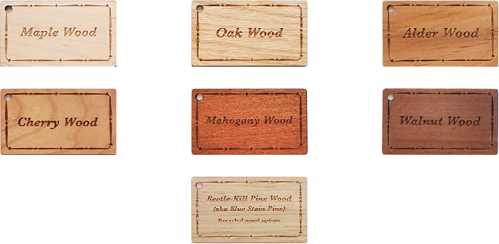 Maple, Oak, Alder, Cherry, Mahogany, Walnut, and Recycled Blue Pine